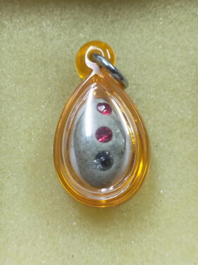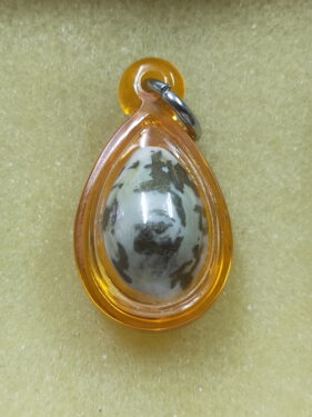 เบี้ยภควจั่น ปี2553 จารหมึกสีทอง อุดผง ฝังพลอย พร้อมเลี่ยม